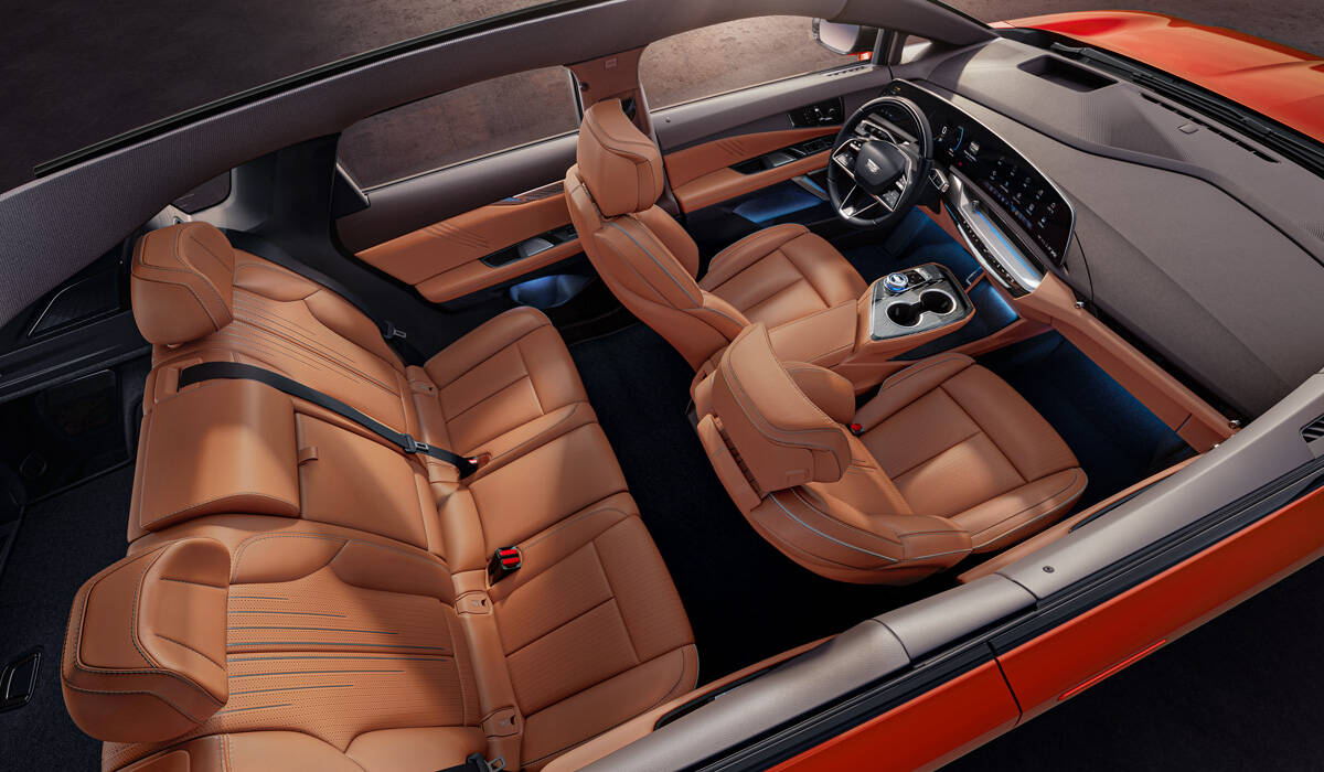 Салон сделан по современным кадиллаковским лекалам. На вершине передней панели располагается изогнутый широкоформатный дисплей диагональю 33 дюйма. Он объединяет в себе приборы, медиасистему и прочие функции. Другие особенности интерьера — двухуровневый центральный тоннель, экран заднего вида вместо зеркала, 126-цветная контурная подсветка и аудиосистема AKG с активным шумоподавлением.
