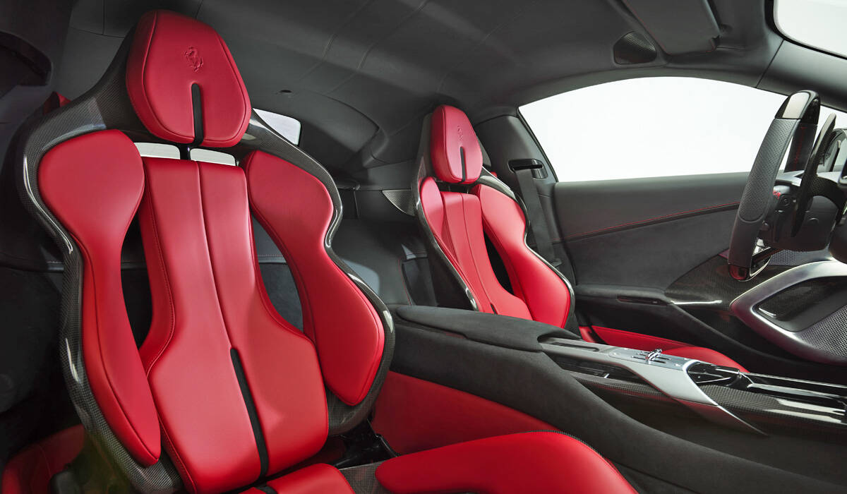 Интерьер выполнен в том же стиле, что у кроссовера Purosangue, но здесь уже три экрана вместо двух. Приборный дисплей самый крупный (15,6 дюйма), центральный тачскрин поменьше (10,25 дюйма), а самый маленький экран у пассажира (8,8 дюйма). В духе времени есть Apple CarPlay, Android Auto и беспроводная зарядка для смартфона, а для обивки частично использовано вторсырье (алькантара на 65% сделана из пластиковых отходов). Установлена аудиосистема Burmester мощностью 1600 ватт с пятнадцатью динамиками.
