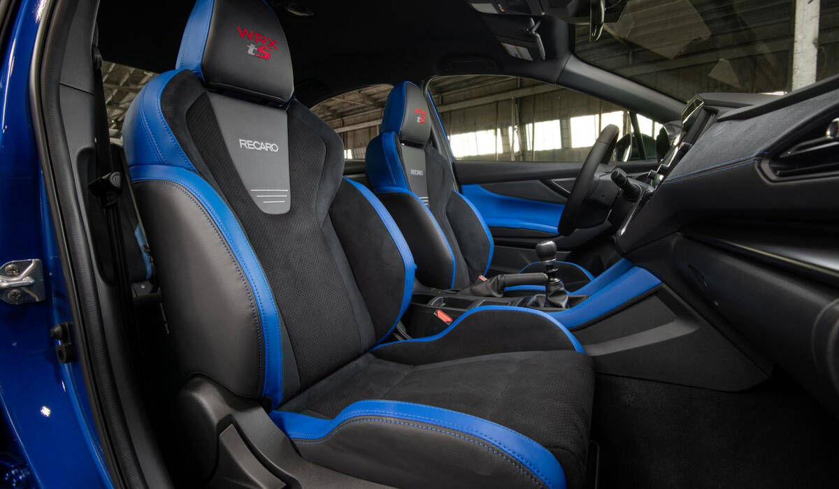 В салоне седана Subaru WRX tS появились виртуальные приборы с экраном диагональю 12,3 дюйма. Для модели WRX это новинка, хотя такой дисплей уже несколько лет ставят на разные модели Subaru для Японии. В отделке салона появились синие вставки, установлены передние кресла Recaro Performance с развитой боковой поддержкой и комбинированной обивкой материалом Ultrasuede. Кнопка запуска двигателя обрела заветные три буквы STI.