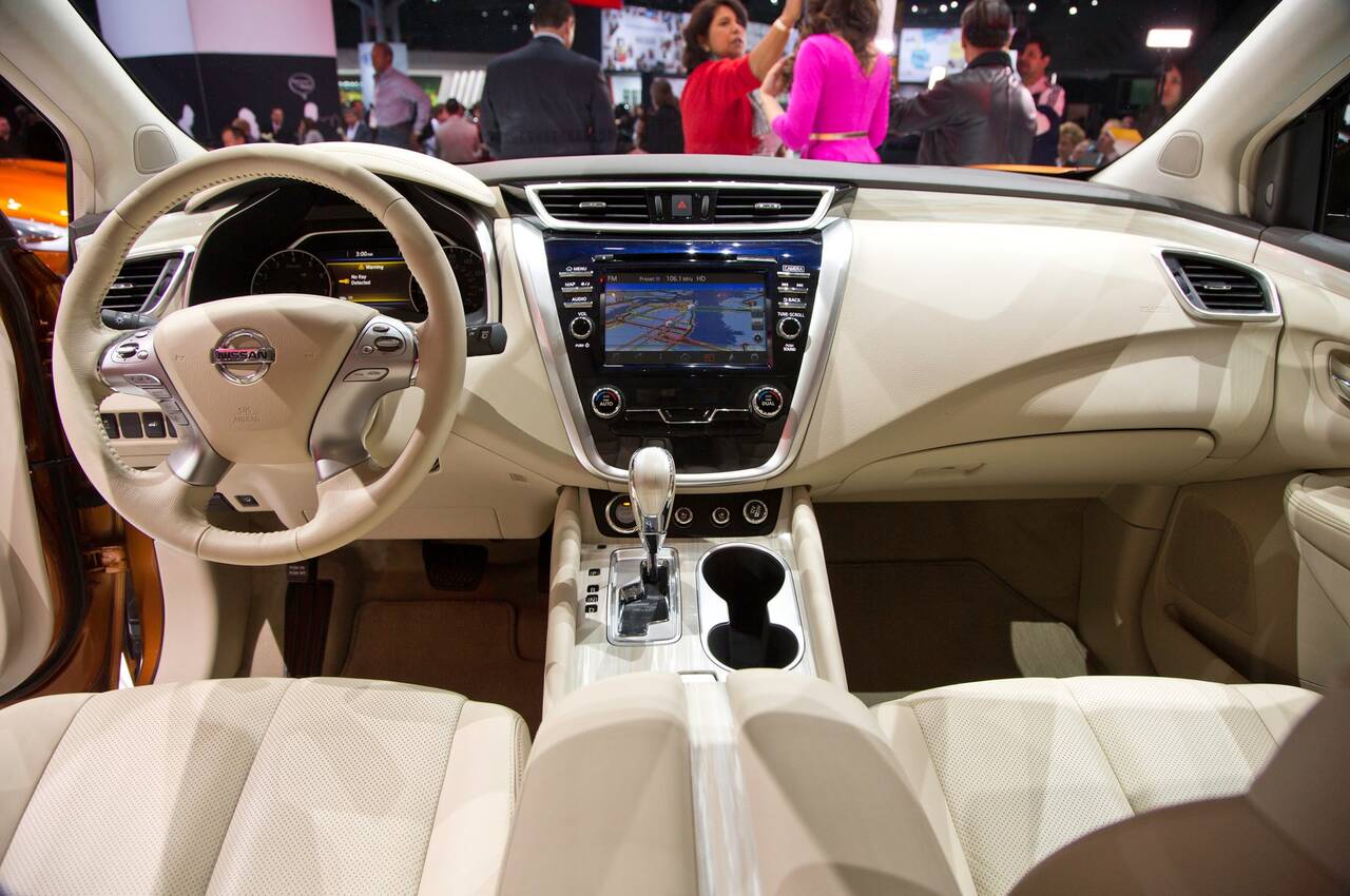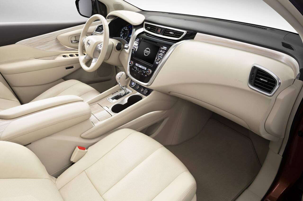 В салоне 2015 Murano комфортно. На выбор предлагаются разные цвета, включая бежевый. Дизайнеры компании акцентировали внимание на отделке приборной панели. В качестве альтернативного варианта есть отделка салона деревом. В отсеке консоли, расположенной за передними сиденьями, удобно хранить мобильный телефон или зарядное устройство. Приборная панель расположена чуть ниже. В стандартную комплектацию входит 7-дюймовый дисплей; 8-дюймовый дисплей – опционально. Кроме того, количество элементов управления на консоли в центре было снижено до 10-ти.
