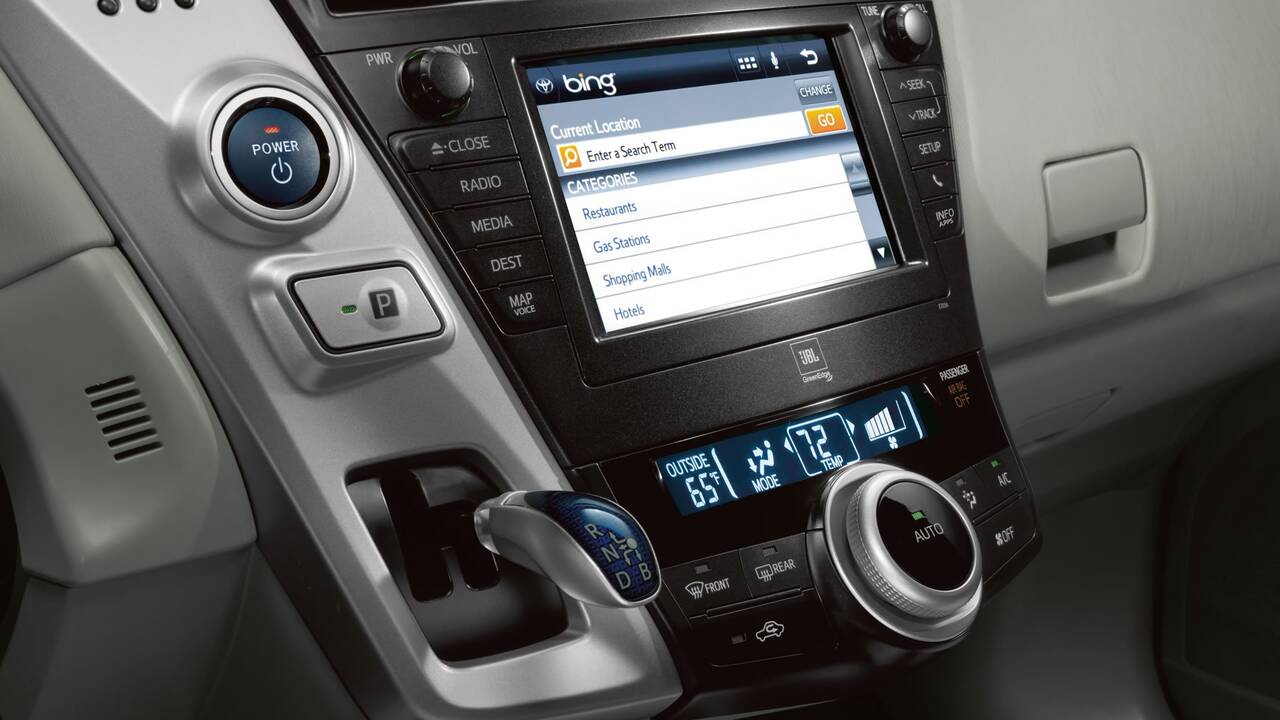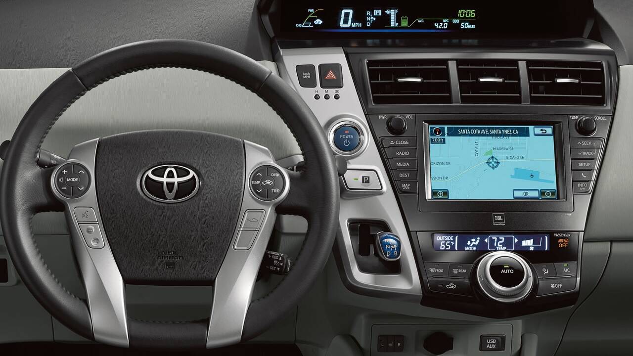 В стандартную комплектацию Prius V входит автоматический климат-контроль, сиденья с тканевой обивкой, 7 подушек безопасности, а также рулевое колесо с регулировкой угла наклона и телескопическим гидроусилителем. Задние сидения складываются в соотношении 60/40. Стоимость базовой комплектации начинается с 29 000 долларов (включая доставку), камеру заднего вида и бесключевой доступ (только на водительскую дверь). Сделав выбор в пользу Toyota Prius V Three, вы получите качественную аудиосистему, Bluetooth, климат-контроль, навигационную систему с голосовым управлением и 6.1-дюймовый сенсорный экран LCD. Есть дополнительный разъем для других MP3 плееров (может быть не совместимо со всеми мобильными телефонами и MP3/WMA плеерами). Возьмите музыку с собой!
