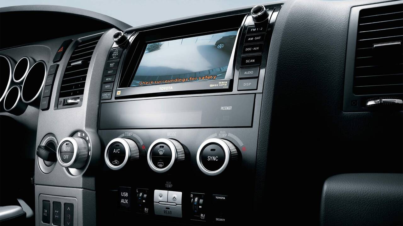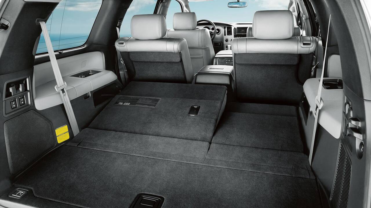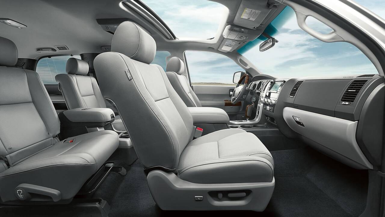 Кабина водителя и сиденья пассажиров в Toyota Sequoia не только удобные, но и качественные; есть места для высоких пассажиров. Доступна поясничная поддержка передних пассажиров и регулировка сидений. Тканевая обивка качественная. Приборная панель включает в себя спидометр, тахометр, показатель уровня топлива и датчики напряжения. На центральной консоли удобно хранить 12 компакт-дисков и 4 коробки DVD. Доступна система вентиляции и кондиционирования.